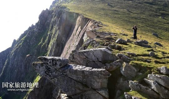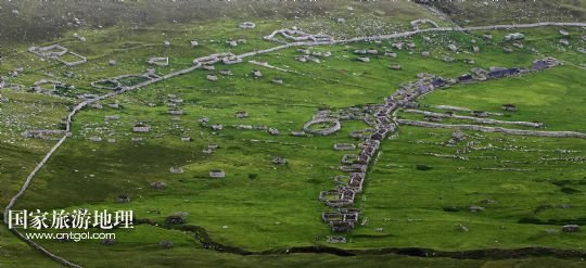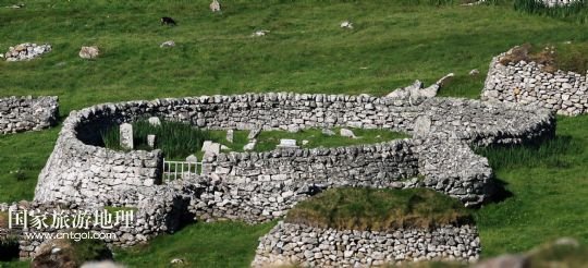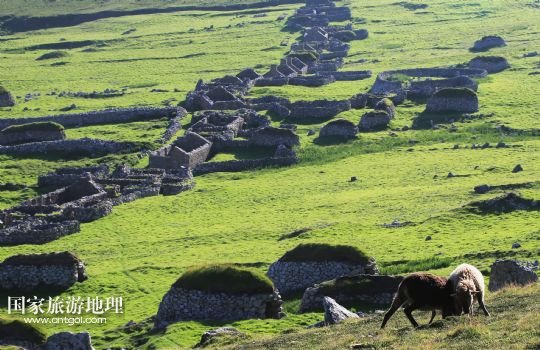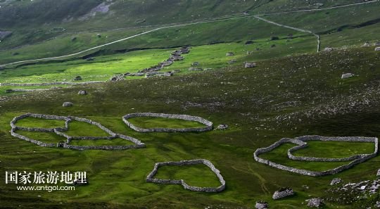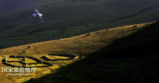 國家旅游地理 英國倫敦8月14日訊 在圣基爾達島已經(jīng)遺棄的村落旁的山坡上,有用石頭圍墻圈起的一塊塊耕地。當(dāng)年在島上定居的村民在這些石圈內(nèi)鋪墊海藻,種植少量谷物。一個個形狀各異的石圈保護著這些寶貴的谷物免遭風(fēng)暴與家畜的侵害(7月19日攝)。
