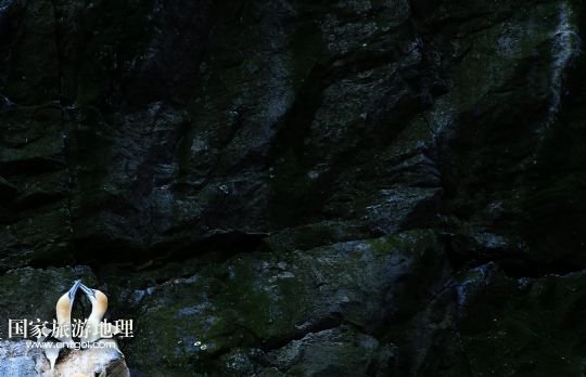 塘鵝在圣基爾達島的巖壁上嬉戲(7月20日攝)。
