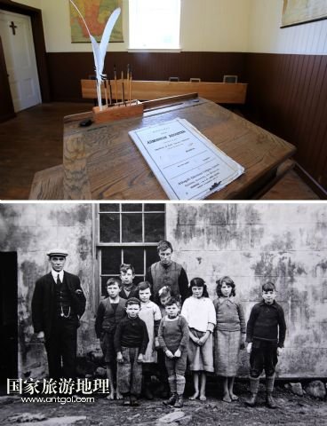 上圖,圣基爾達島上只有一個教室,一排課桌的小學(xué)校內(nèi)景(7月19日攝)。學(xué)校后來經(jīng)過重新整修。下圖,當(dāng)年島上學(xué)校師生的合影(資料照片,蘇格蘭國家信托基金會提供)。
