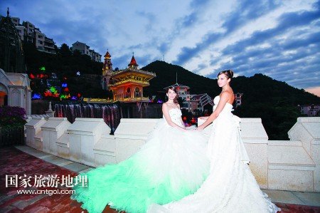 乘著電瓶車,從客天下廣場穿過雅致的圣山湖住宅區(qū),赫然出現(xiàn)在眼前的卻是大型婚禮殿堂,純歐式的建筑群隱匿在青山綠水中:乳白色的圓形屋頂、七彩斑斕的玻璃窗、富麗堂皇的大吊燈,見證了一對又一對新人走進幸福的殿堂。在充滿異域風情的幸福里大街,蘇格蘭風笛表演、皇家馬車、中世紀格調的咖啡館,一幕又一幕,讓人恍若時空交錯。