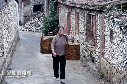 5月11日,在福建泉州豐澤區(qū)東海街道蟳埔社區(qū),一位蟳埔女挑著擔子走在村道上,村道兩旁是古老的蠔殼厝。宋元時期,這里是泉州“海上絲綢之路”的重要港口,遠洋航船載著絲綢、茶葉、瓷器等貨物運往世界各地,返程時壓船的海蠣殼成了村民們的建筑材料。