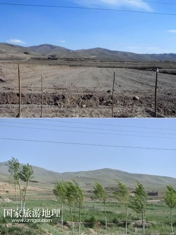 國家旅游地理 寧夏中衛(wèi)6月9日訊 上圖上:2014年5月的資料照片上甘鹽池一片荒涼;上圖下:6月4日,記者拍攝的甘鹽池已是綠意盎然(拼版照片)。寧夏海原縣甘鹽池地處黃土高原干旱帶上,平均海拔約2100米,年均降雨量在280毫米左右,自然災(zāi)害頻繁,十年九旱。2014年以前,這片近12萬畝的土地可謂一片荒蕪。2014年,海原縣甘鹽池管委會(huì)通過確立“盆地改良、種草養(yǎng)羊、綠化美化、提升人氣”的工作思路,對(duì)2.2萬畝砂石地和山坡地進(jìn)行改良和治理,如今甘鹽池滿滿的綠意讓人為之一振。 新華社記者 李然 攝
