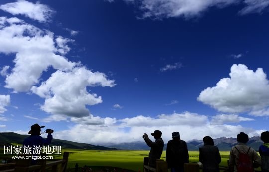 7月22日,游客在門源油菜花田的觀花臺上觀賞。