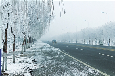 12月23日,銀川永寧快速通道兩旁呈現(xiàn)“霧凇”美景。據(jù)了解,霧凇俗稱樹掛,是一種冰雪美景。它是由于霧中無數(shù)零攝氏度以下而尚未結(jié)冰的霧滴隨風(fēng)在樹枝等物上不斷積聚凍粘的結(jié)果。霧凇現(xiàn)象在我國(guó)北方是很普遍的。記者 吳春霖 攝