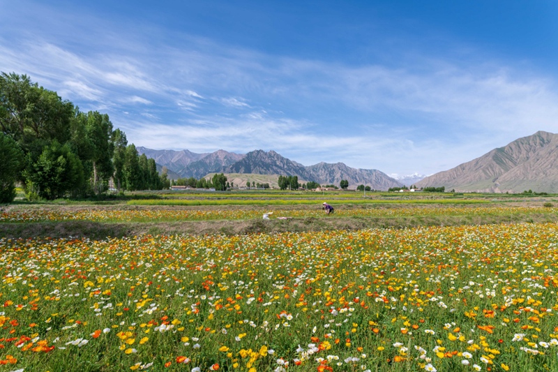 時值盛夏,地處祁連山北麓高海拔山區(qū)的甘肅省高臺縣新壩鎮(zhèn)紅沙河村種植的虞美人繽紛綻放,形成花海景觀。近年來,高臺縣新壩鎮(zhèn)將花卉蔬菜制種作為特色產(chǎn)業(yè)來抓,積極引導農(nóng)戶規(guī)?;?、集中化種植,成為當?shù)剞r(nóng)業(yè)增效、農(nóng)民增收的支柱產(chǎn)業(yè)之一。